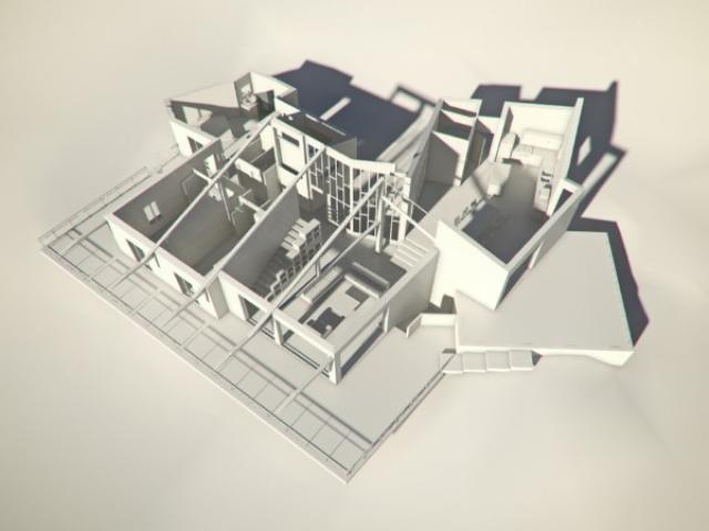 Ainsi, sur un versant, une échancrure occasionne une terrasse en élévation, en contiguïté avec une mezzanine accessible depuis le salon.